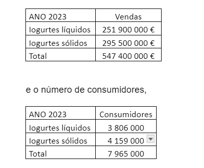 No respeito ao consumo dos iogurtes em Portugal, no ano de 2023, através do Euromonitor e do TGI, foi possível quantificar em euro o valor do total dessas vendas,